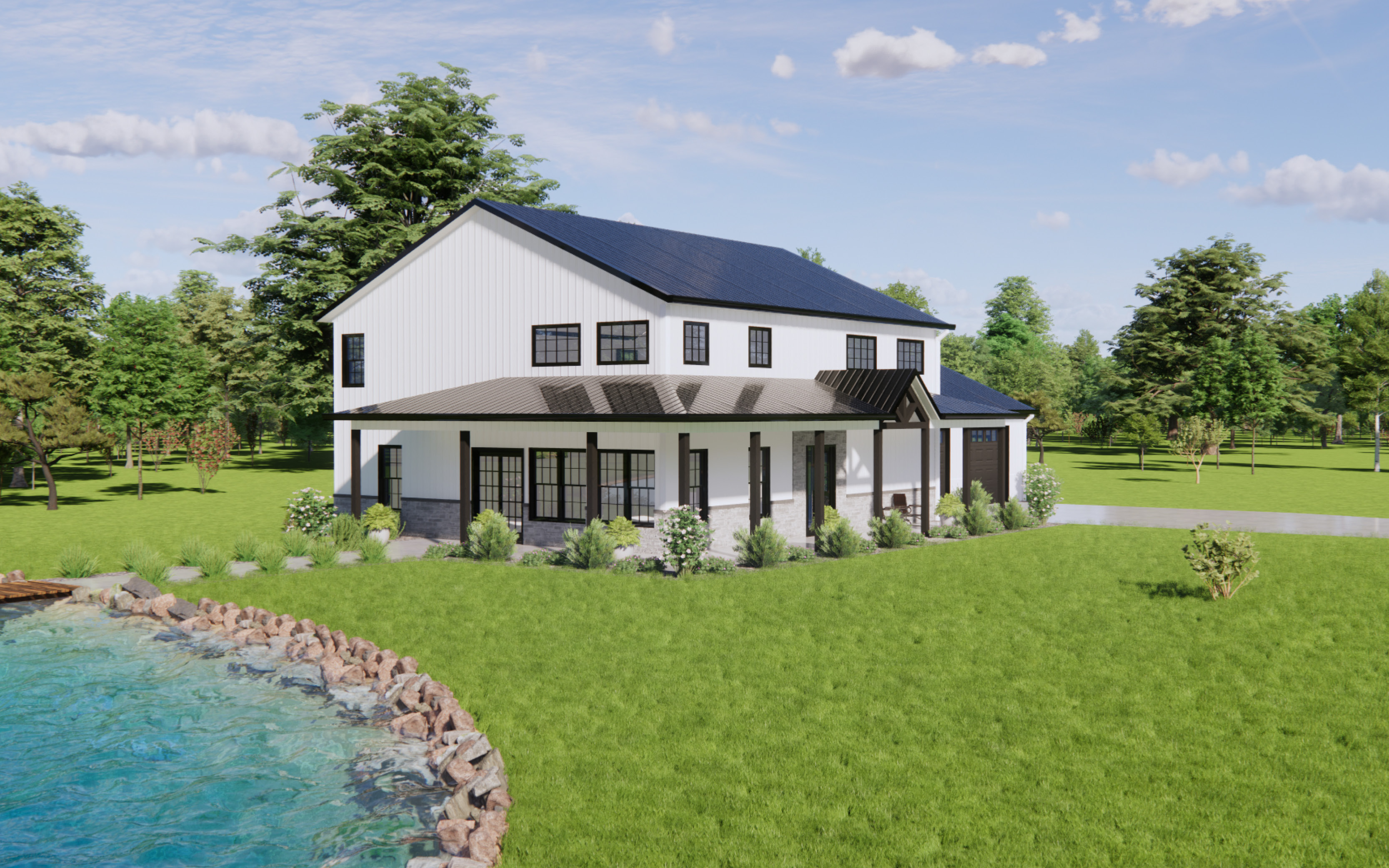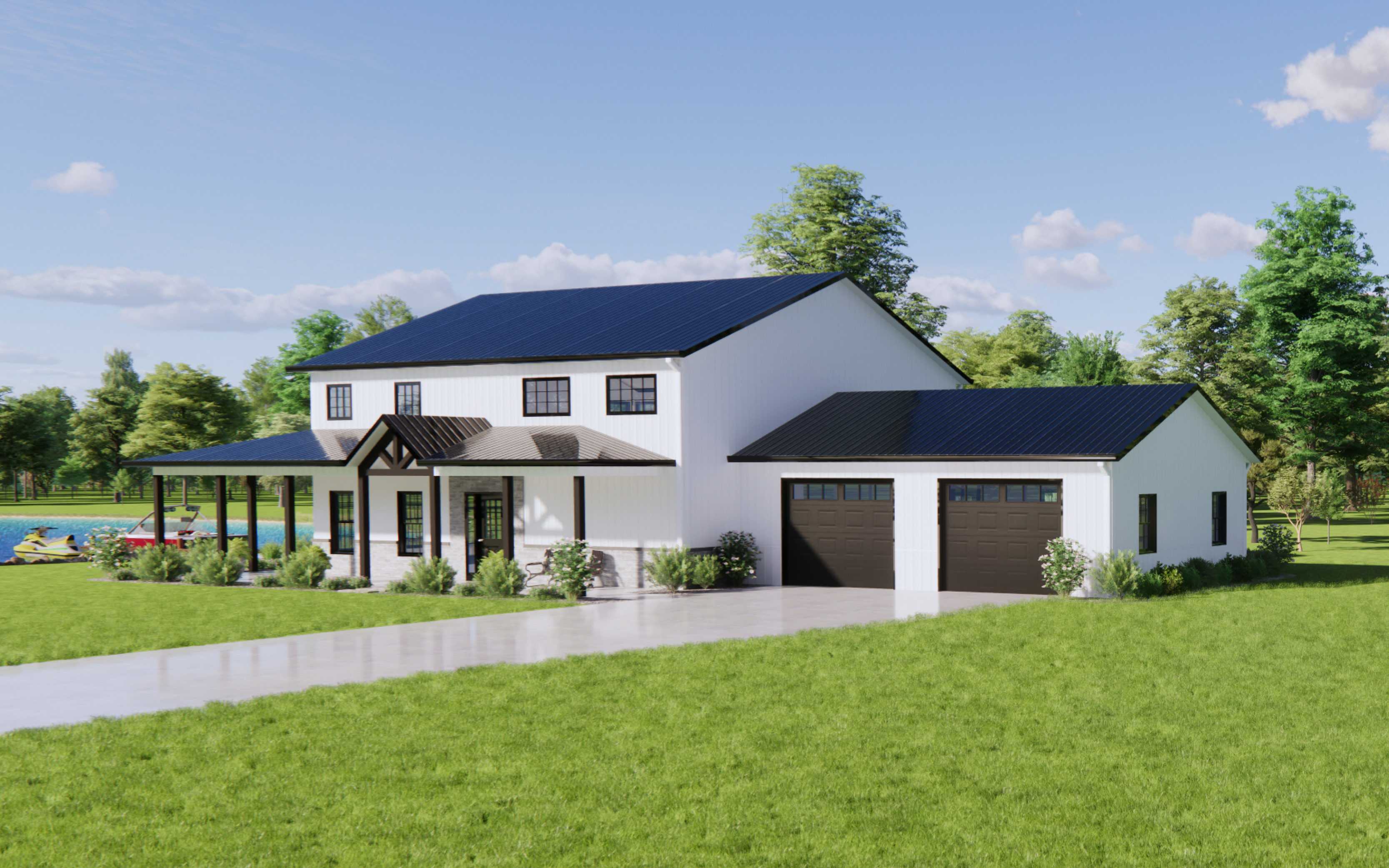 The Lakeside is a modern barndominium floor plan with 2,342 square feet of living space. It features three bedrooms, two-and-a-half bathrooms, and a two-car garage.